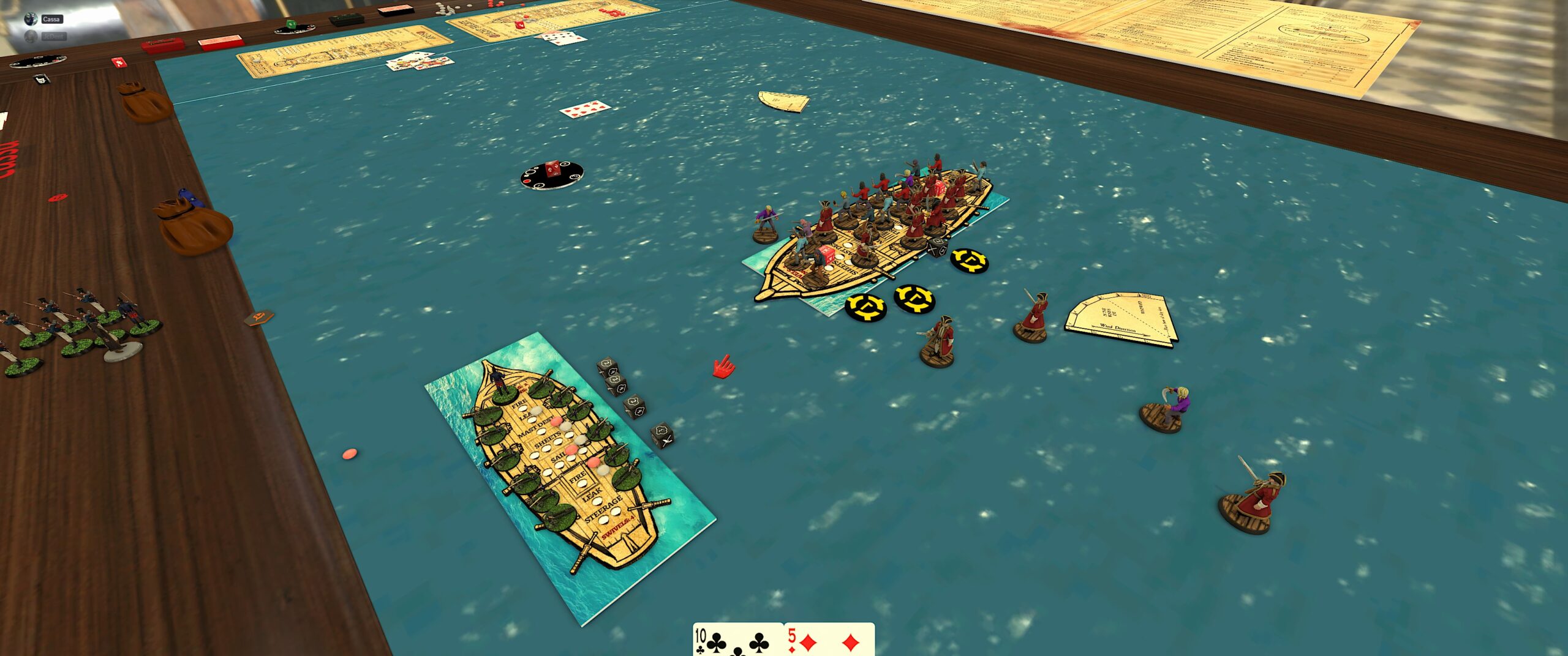 TTS screenshot of playing Blood & Thunder: infantry next to my boat indicates how much I’m losing whenever Cassa fires at me while crossing the T.