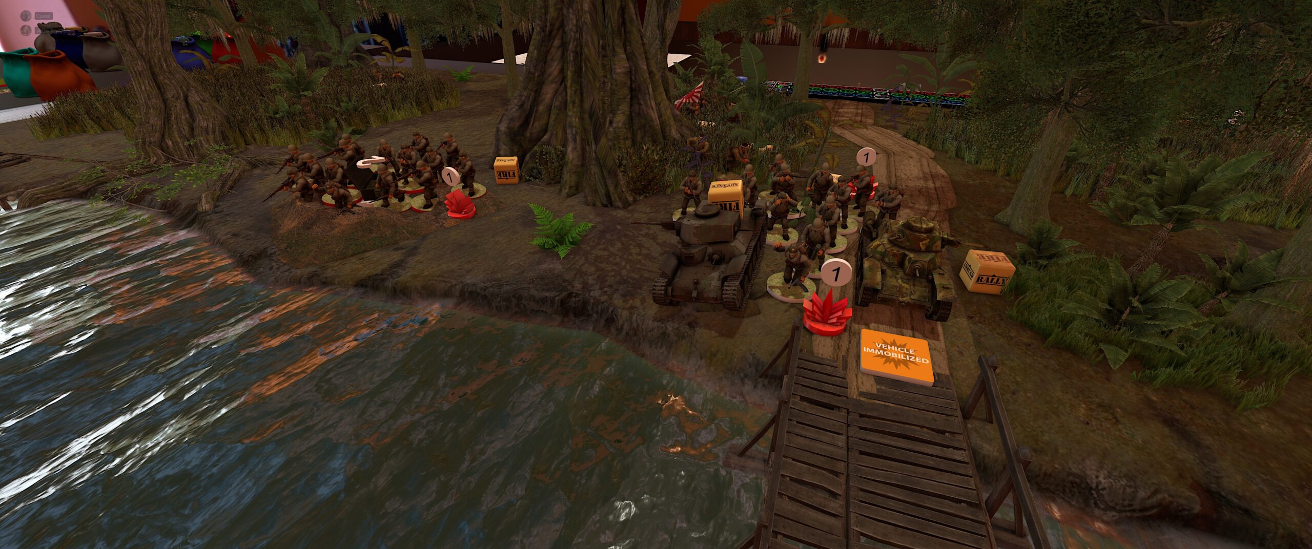 TTS screenshot: tanks and infantry in the jungle, as well as pin and “vehicle immobilized” markers